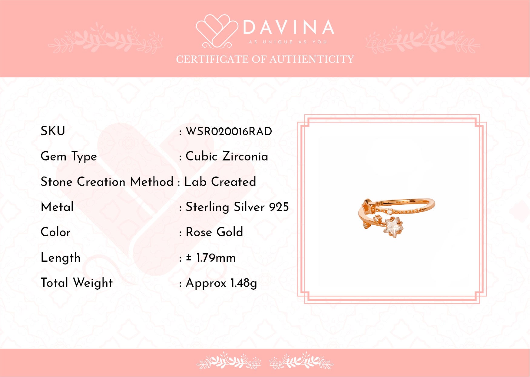 Buat momen spesialmu lebih bersinar dengan Davina Ladies Esra Ring. Terbuat dari perak sterling S925 dengan lapisan rose gold yang mewah, cincin ini dihiasi batu zirconia berbentuk bintang yang memberikan kilau elegan. Sempurna untuk melengkapi gaya sehari-hari atau sebagai kado berharga untuk orang tercinta.